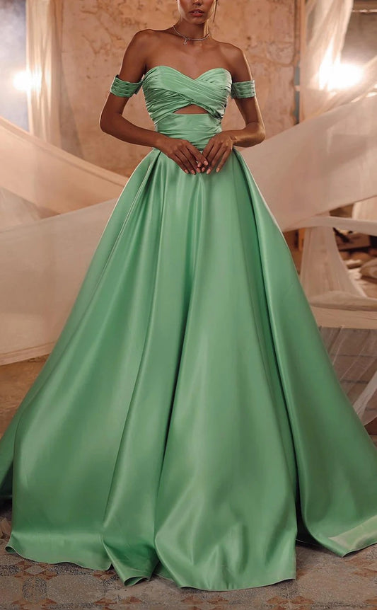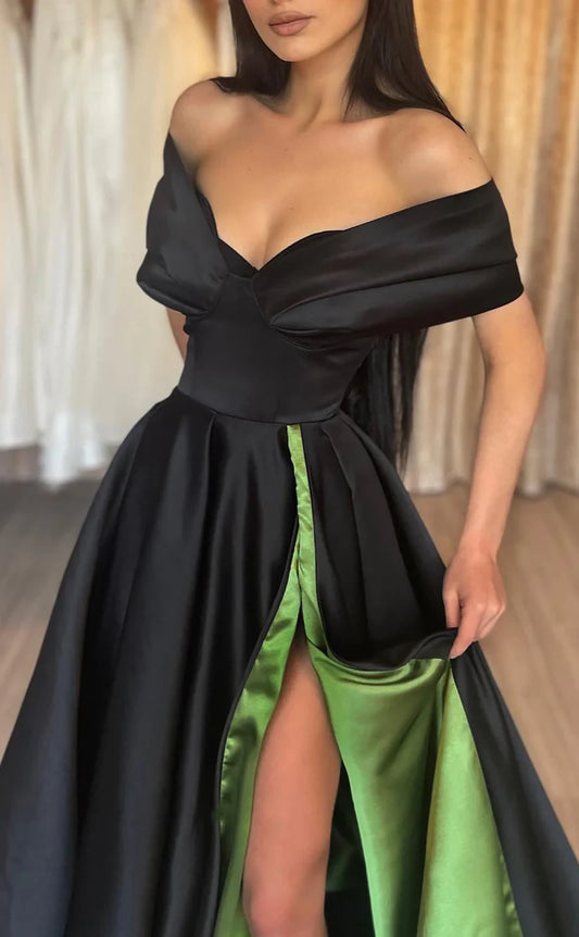RP1540-Elegant Green A-Line Off-the-Shoulder Ruched Sleeveless Satin Prom Evening Dresses Formal Party Gowns With Slit