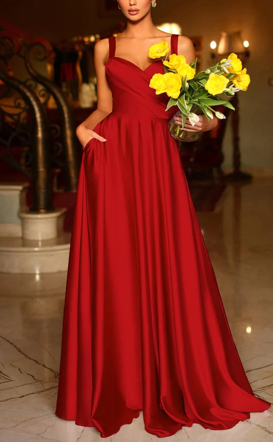 RP1505-Elegant Green A-Line Spaghetti Ruched Sleeveless Satin Prom Evening Dresses Formal Party Gowns