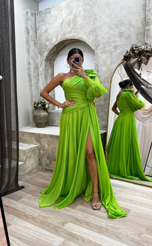 RP1562-Gorgeous Yellow A-Line One Shoulder Flower One Long Sleeve Chiffon Prom Evening Dresses Formal Party Gowns With Slit