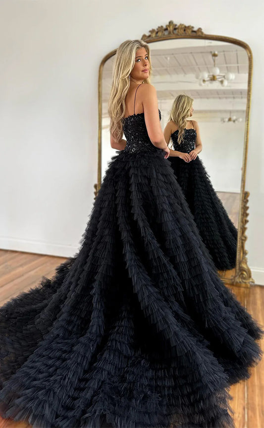 RP1533-Elegant Red A-Line Spaghetti Sequins Ruffles Sleeveless Tulle Prom Evening Dresses Formal Party Gowns With Slit