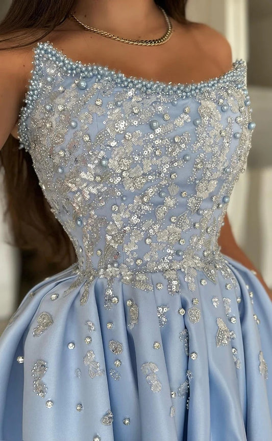 RP1187-New Sky Blue A-Line Strapless Pearls Sequins Sleeveless Long Prom Evening Dresses Formal Party Gowns With Split
