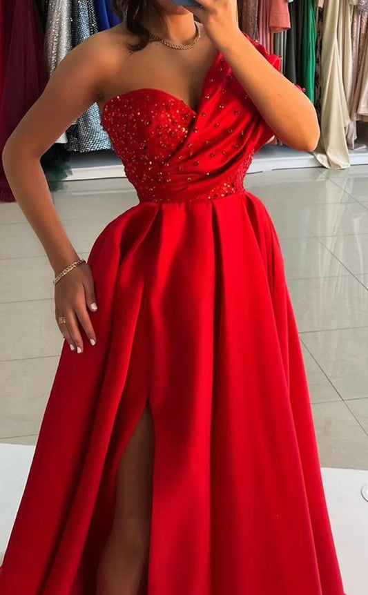 RP1416-Elegant Red A-Line One Shoulder Beaded Cap Sleeves Prom Evening Dresses Formal Party Gowns With Slit