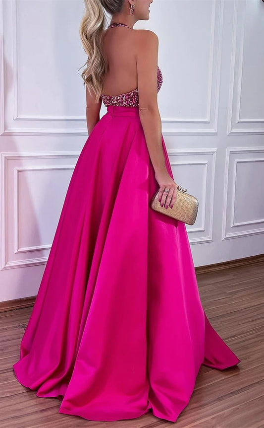 RP1444-Luxury Fuchsia A-Line Halter Crystals Sleeveless Satin Prom Evening Dresses Formal Party Gowns With Train