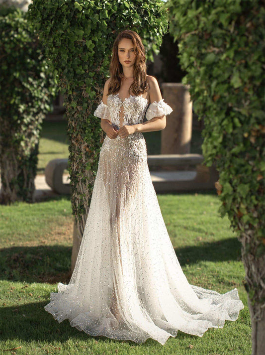 Gorgeous & Elegant A-Line Boho Wedding Dresses Strapless Beads Sequins Appliqued Tulle Sweep Train Bridal Gowns Custom