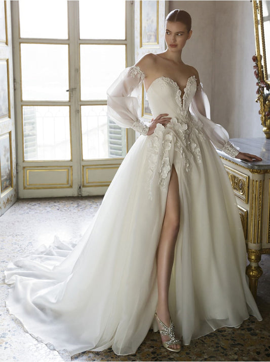 Elegant & Modern A-Line Boho Wedding Dresses Sweetheart Appliqued Detachable Long Sleeves Covered Buttons Court Train Satin Bridal Gowns