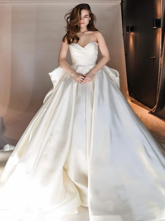 Elegant A-Line Wedding Dresses Sweetheart Pleated Ruched Bowknot Sleeveless Court Train Satin Bridal Gowns Custom Made