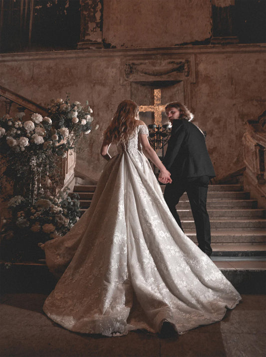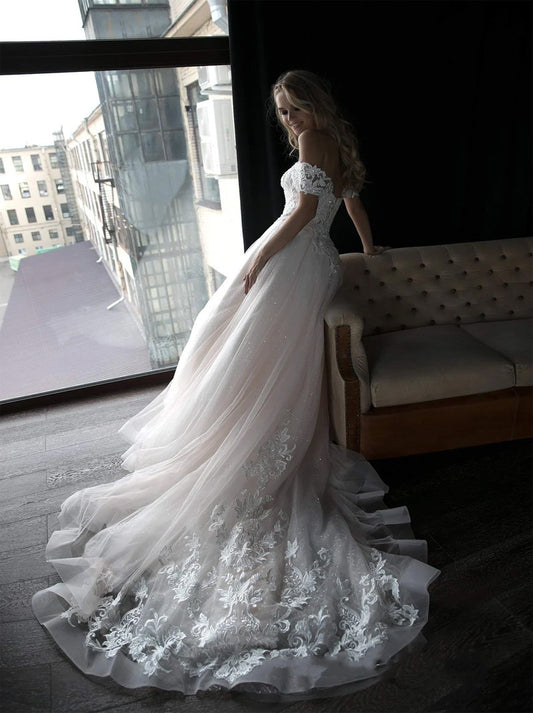 Modern A-Line Wedding Dresses Sweetheart Off The Shoulder Cap Sleeves Appliques Beaded Lace Up Tulle Court Train Bridal Gowns For Women