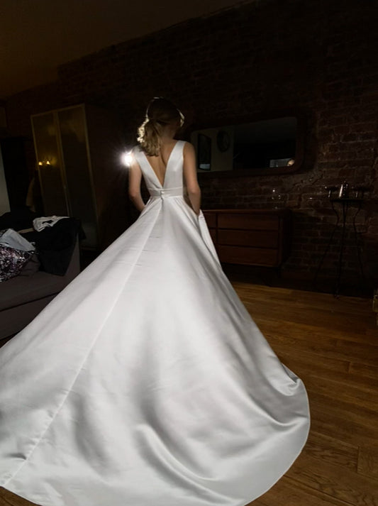 Elegant A-Line Wedding Dresses V-Neck Sleeveless Pleated Backless Satin Court Train Bridal Gowns Custom Made