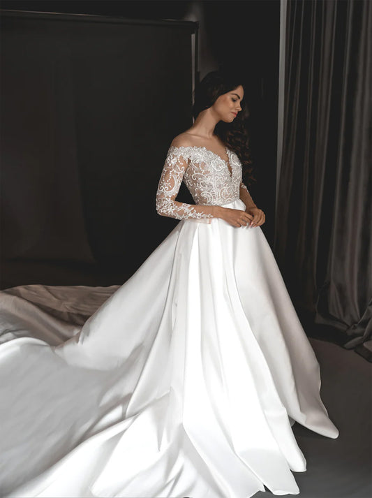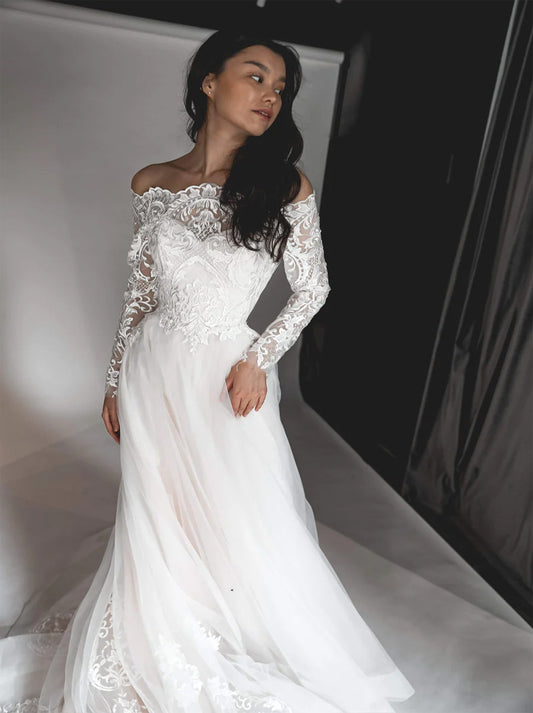 Elegant A-Line Wedding Dresses Off The Shoulder Lace Appliques Beads Long Sleeves Sweep Train Covered Buttons Tulle Bridal Gowns Custom Made