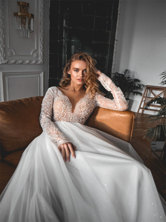 Sparkling A-Line Wedding Dresses V-Neck Beads Sequins Appliques Covered Buttons Lace Long Sleeves Tulle