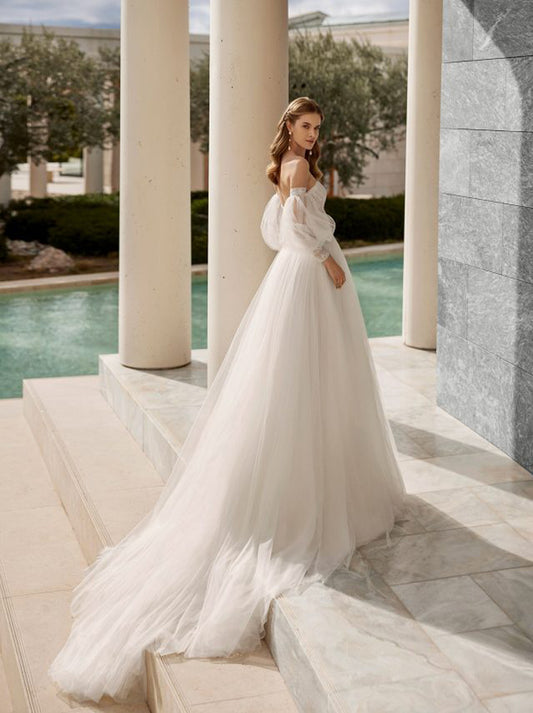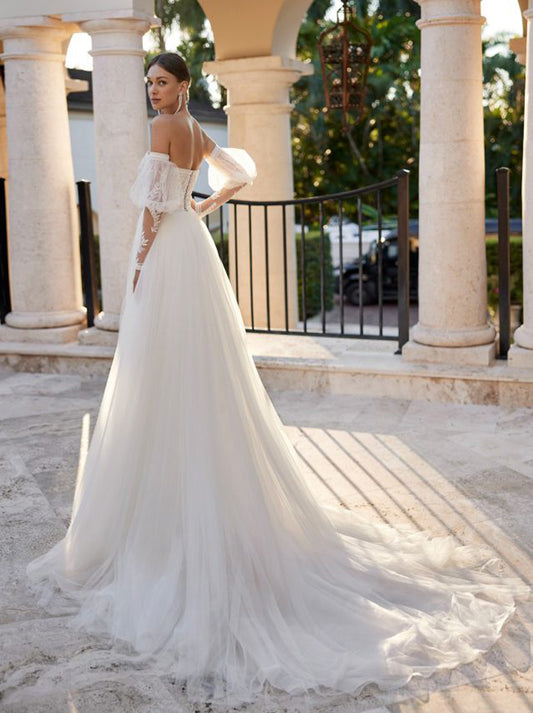 Ivory A-Line Wedding Dresses Sweetheart Appliques Beads Detachable Puffy Sleeves Tulle Court Train Bridal Gowns Custom Made