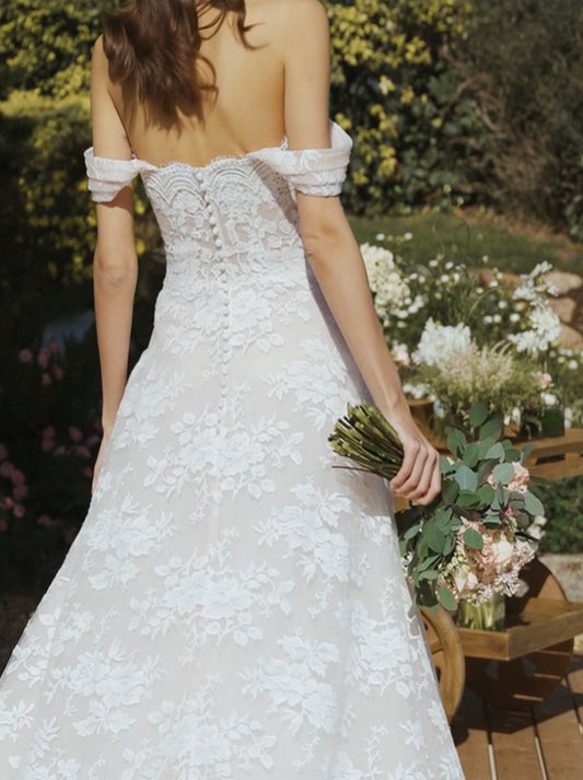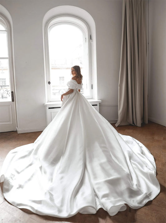 Elegant A-Line Wedding Dresses Sweetheart Off The Shoulder Pleated Court Train Satin Bridal Gowns For Women