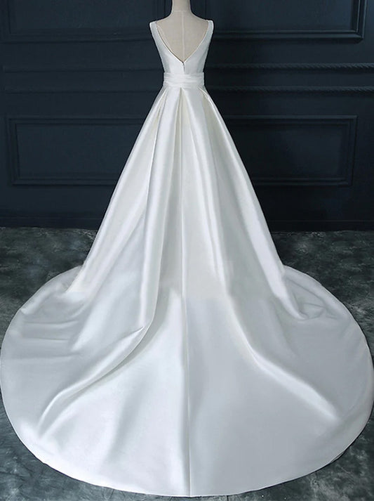 White A-LIne Wedding Dresses Strapless Pleated Side Slit Backless Satin Court Train Bridal Gowns Custom Made
