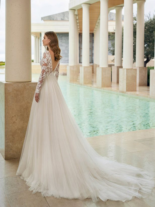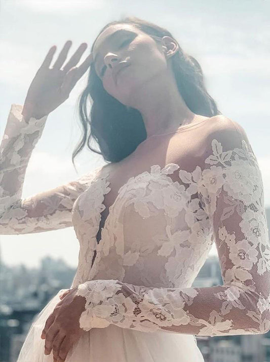 Sexy A-Line Wedding Dresses Scoop Illusion Long Sleeves Appliques Backless Sweep Train Tulle Bridal Gowns