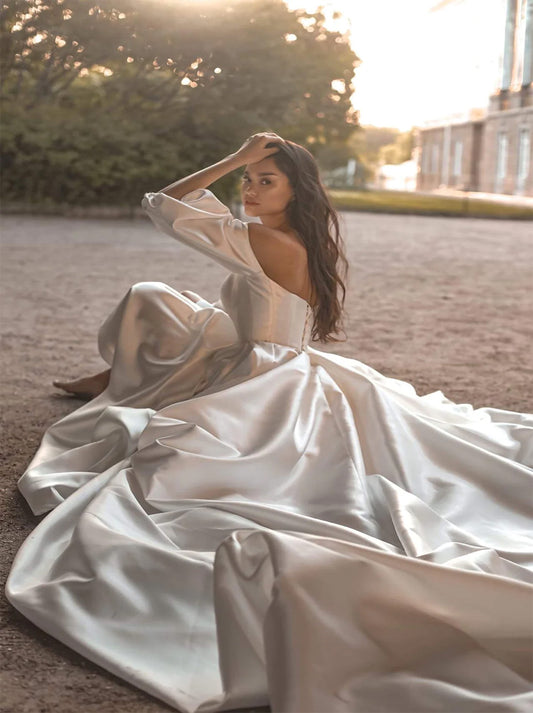 Elegant A-Line Wedding Dresses Strapless Half Long Sleeves Court Train Satin Bridal Gowns Custom Design