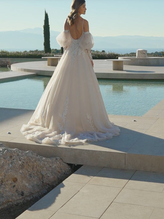 Ivory A-Line Wedding Dresses Spaghetti Appliques Detachable Puffy Long Sleeves Court train Tulle Bridal Gowns Custom Made