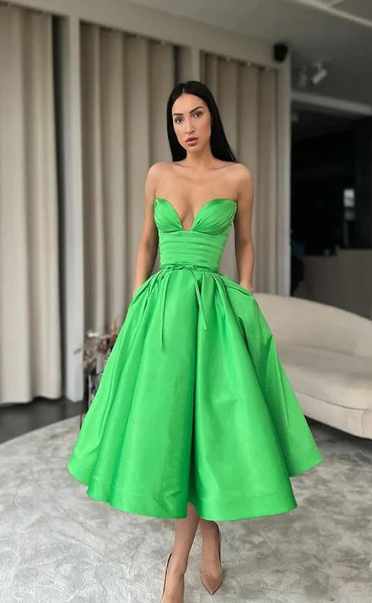RP021-Green A-Line Sweetheart Sash Pleated Backless Tea Length Satin Prom Cocktail Dresses Formal Party Gowns With Belt