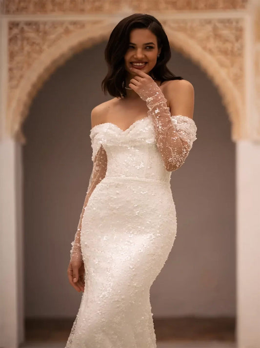 Sparkling & Classic Mermaid Wedding Dresses Sweetheart Sequins Beads Long Sleeves Tulle Sweep Train Bridal Gowns Custom