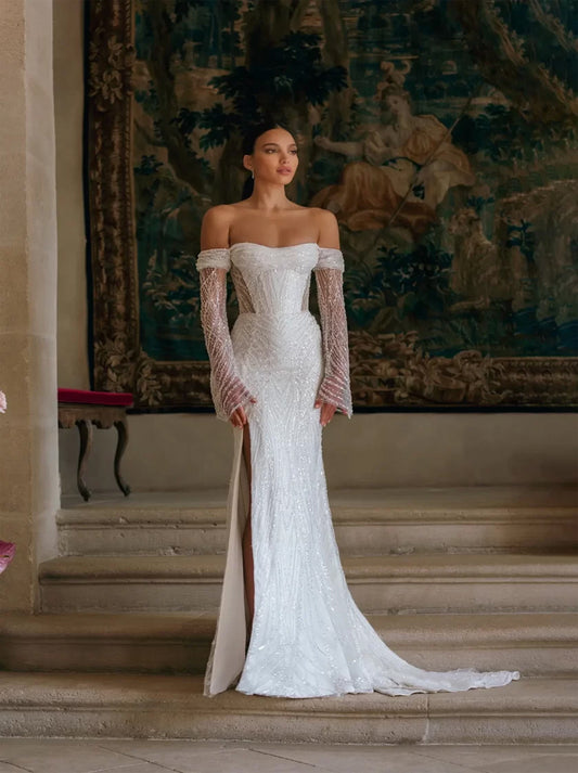 Sparkling & Classic Mermaid Wedding Dresses Sweetheart Beads Long Sleeves Tulle Sweep Train Bridal Gowns Custom With Slit