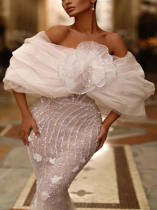 Sparkling & Luxurious Mermaid Boho Wedding Dresses Off The Shoulder Long Sleeves Sequins Beads Long Bridal Gowns With Slit