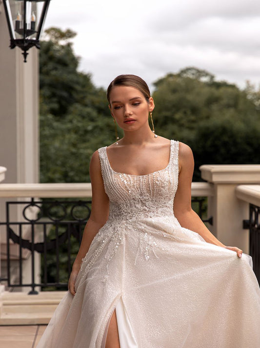 Sparkling A-Line Bridal Gowns Spaghetti Sequins Beads Tulle Court Train Bridal Gowns With Slit
