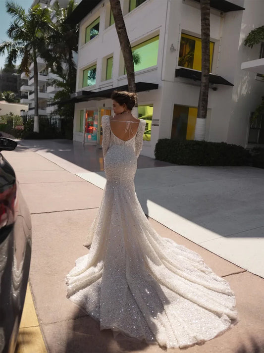Sparkling Mermaid Wedding Dresses Sweetheart Long Sleeves Sequins Beads Court Train Bridal Gowns Custom Made