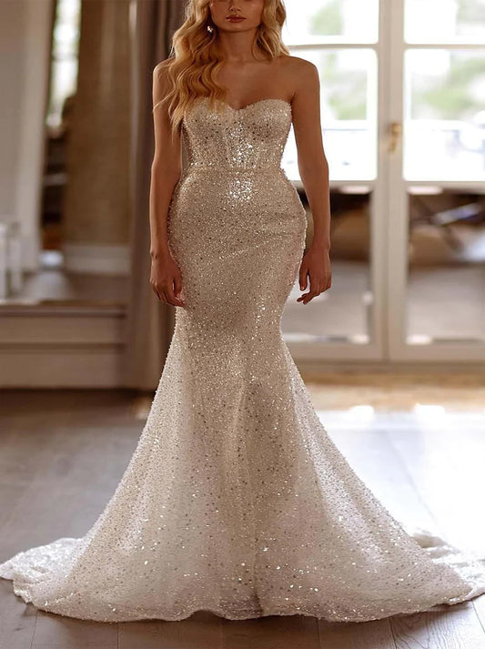 Sparkling Mermaid Wedding Dresses Sweetheart Sequins Tulle Sweep Train Bridal Gowns Custom Made