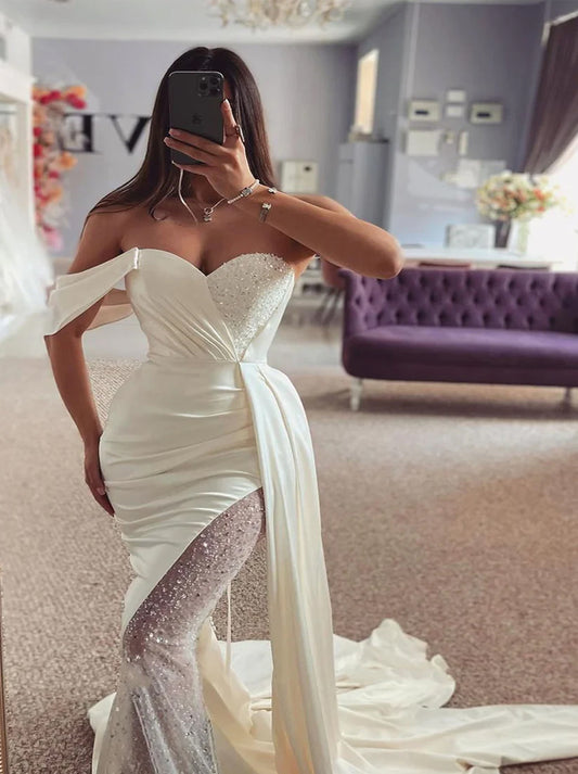 Sparkling Mermaid Wedding Dresses Strapless Off The Shoulder Lace Up Beads Sequins Sweep Train Bridal Gowns Custom Made