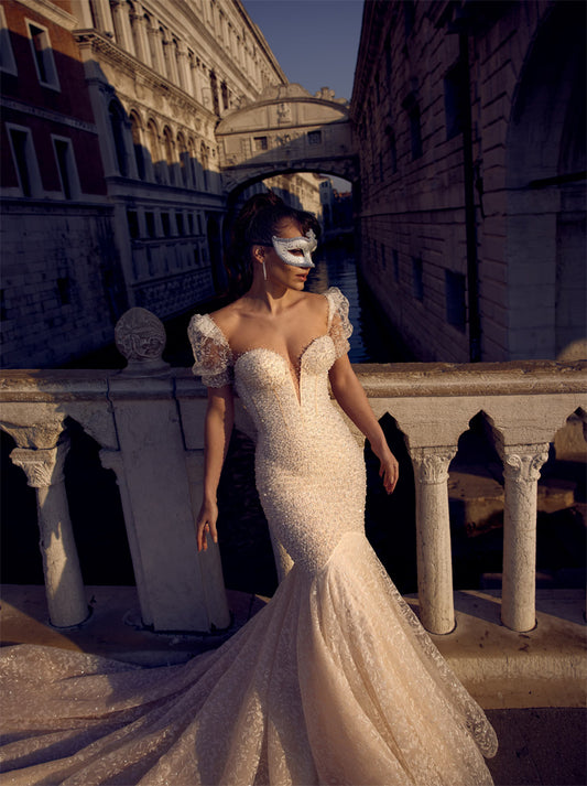 Sparkling Mermaid Wedding Dresses Sweetheart Beads Appliqued Cap Sleeves Tulle Sweep Train Bridal Gowns Custom Made