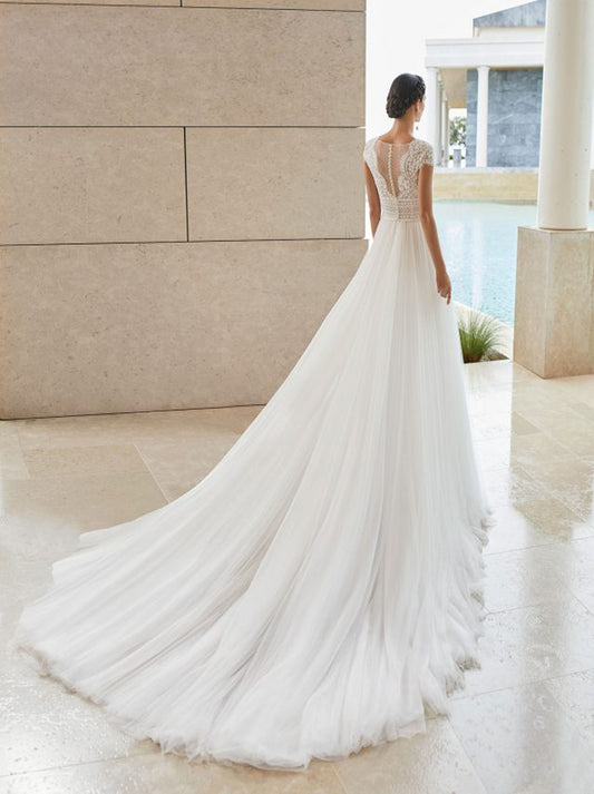 White A-Line Wedding Dresses V-Neck Appliques Lace Cap Sleeves Sash Tulle Court Train Bridal Gowns Custom Design