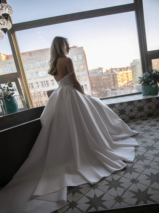 White A-Line Wedding Dresses Spaghetti Sequins Sleeveless Lace Up Satin Sweep Train Bridal Gowns Custom Made