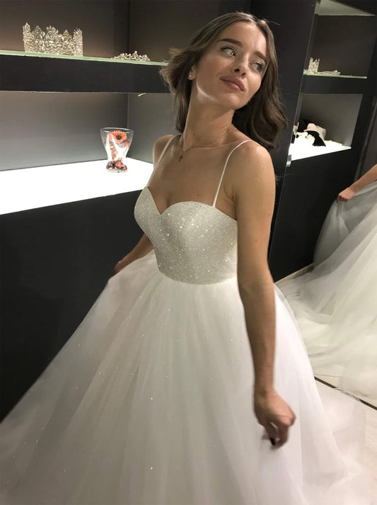 White A-Line Wedding Dresses Spaghetti Sequins Sleeveless Lace Up Tulle Floor Length Bridal Gowns Custom Made