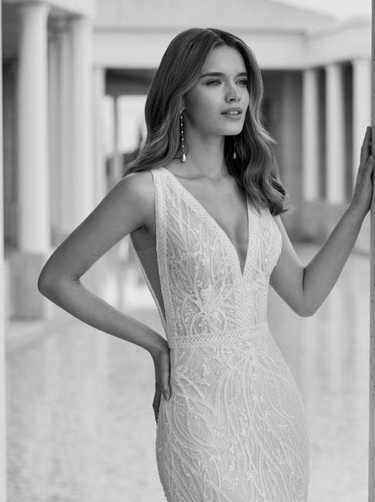 White Mermaid Wedding Dresses V-Neck Embroidered Beads Covered Buttons Court Train Lace Bridal Gowns Custom Design