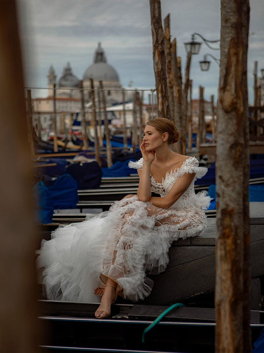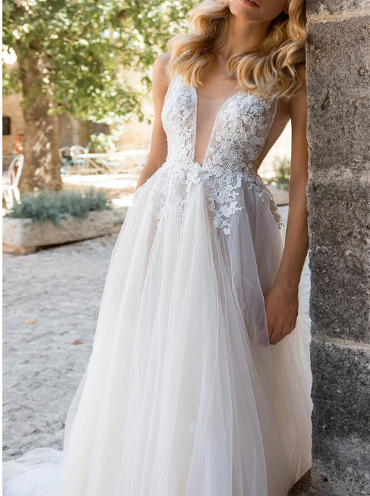 Charming & Gorgeous A-Line Wedding Dresses V-Neck Appliqued Tulle Sweep Train Bridal Gowns Custom Made