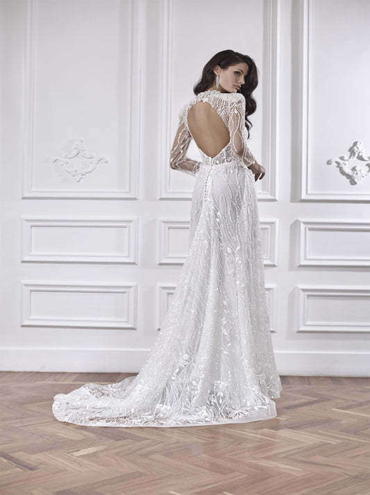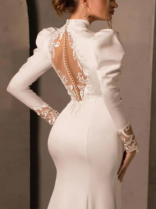 Charming & Elegant Mermaid Wedding Dresses High Collar Embroidered Bittons Satin Sweep Train Bridal Gowns With Slit