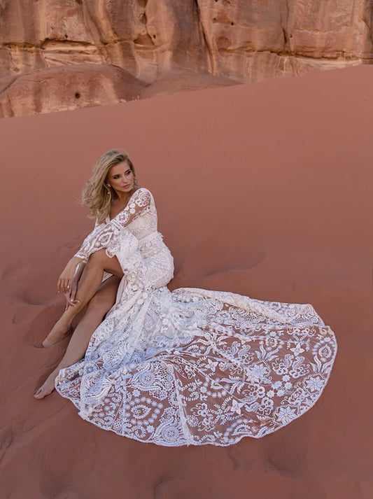 Charming & Elegant Mermaid Wedding Dresses V-Neck Long Sleeves Tulle Sweep Train Bridal Gowns