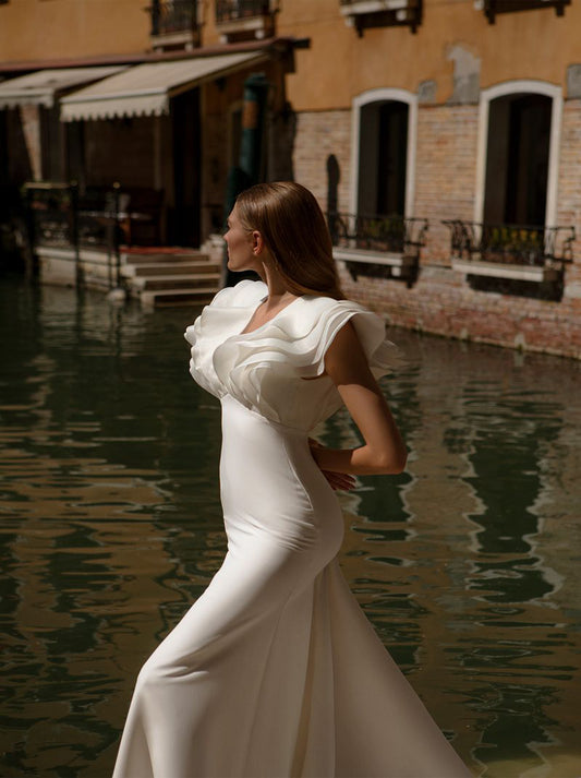 Charming & Gorgeous Mermaid Wedding Dresses V-Neck Pleated Satin Sweep Train Bridal Gowns With A Jacket