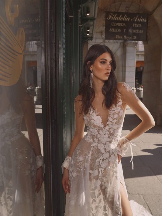 Charming & Elegant A-Line Wedding Dresses V-Neck Appliqued Tulle Sweep Train Bridal Gowns With Slit