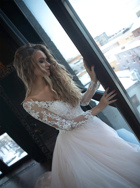Charming A-Line Wedding Dresses Scoop Beads Appliqued Long Sleeves Tulle Sweep Train Bridal Gowns Custom Custom