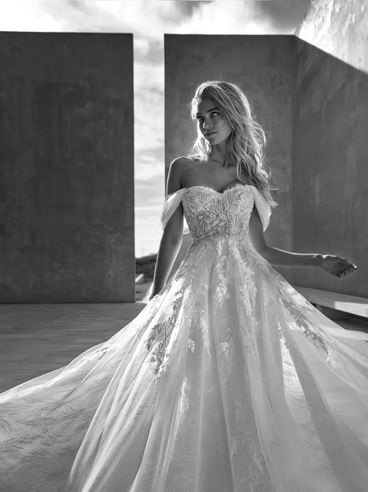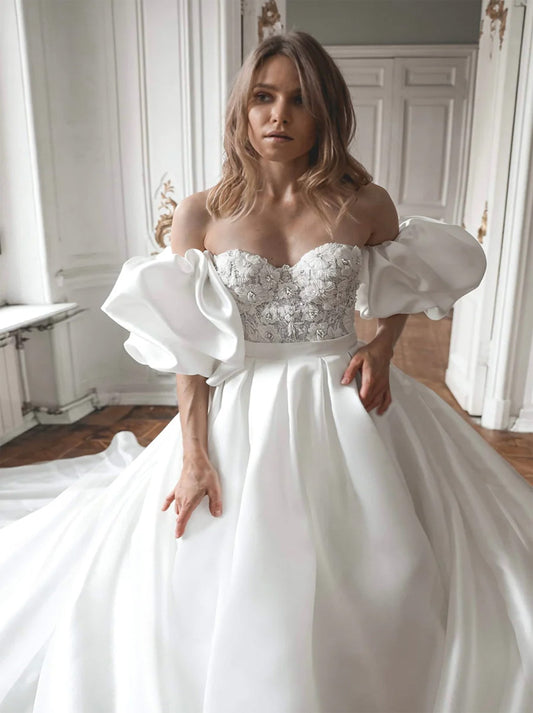 Charming A-Line Wedding Dresses Sweetheart Appliques Ruched Detachable Puffy Short Sleeves Satin Court Train Bridal Gowns Custom Made