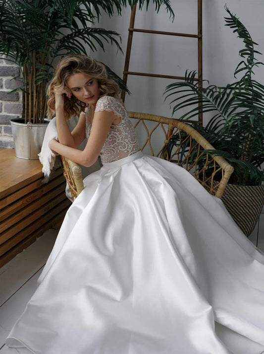Charming A-Line Wedding Dresses Illusion Scoop Beads Appliques Buttons Cap Sleeves Satin Floor Length Bridal Gowns Custom Made