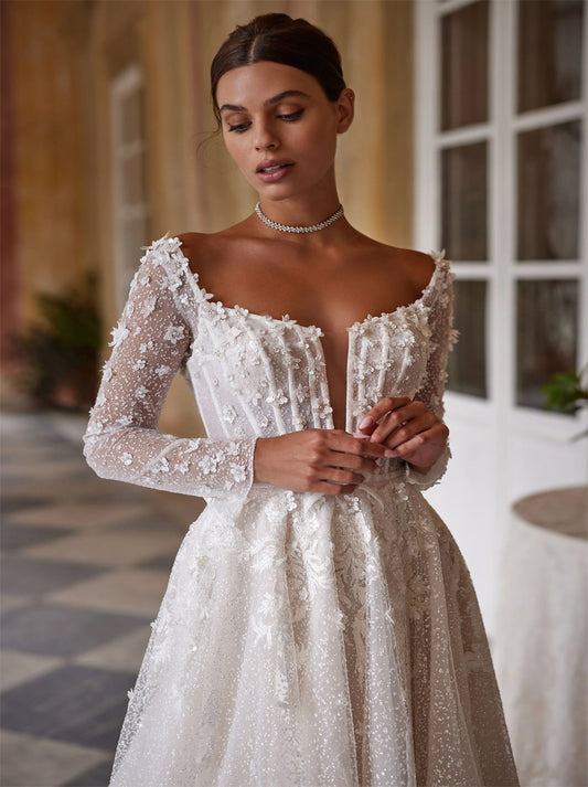 Charming A-Line Wedding Dresses Sweetheart Long Sleeves Lace Appliques Beads Zipper Tulle Court Train Bridal Gowns