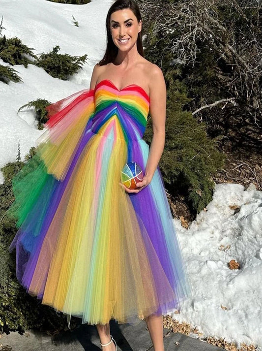 Charming A-Line Sweetheart Sleeveless Rainbow Midi Length Tulle Prom Dress Homecoming Graduation Dresses Evening Dresses Cocktail Ball Gowns For Women Custom Made