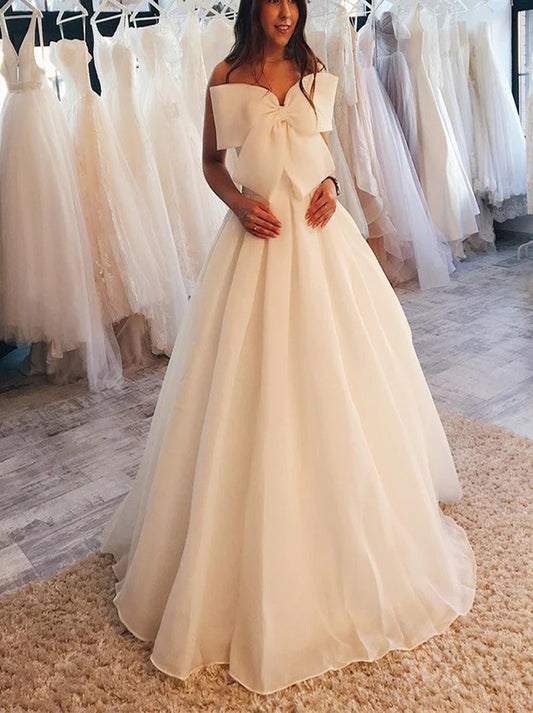 Charming A-Line Wedding Dresses Strapless Sleeveless Bowknot Lace Up Sweep Train Organza Bridal Gowns Custom Made
