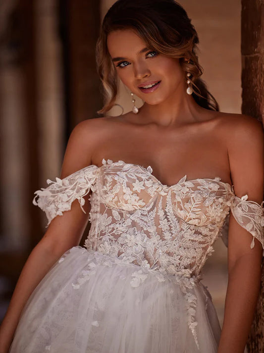 Charming A-Line Boho Wedding Dresses Sweetheart Appliqued Cap Sleeves Tulle Sweep Train Bridal Gowns Custom Made