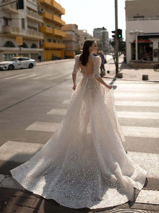 Charming A-Line Beach Wedding Dresses High Collar Sequins Appliqued Backless Court Train Tulle Bridal Gowns Custom Made