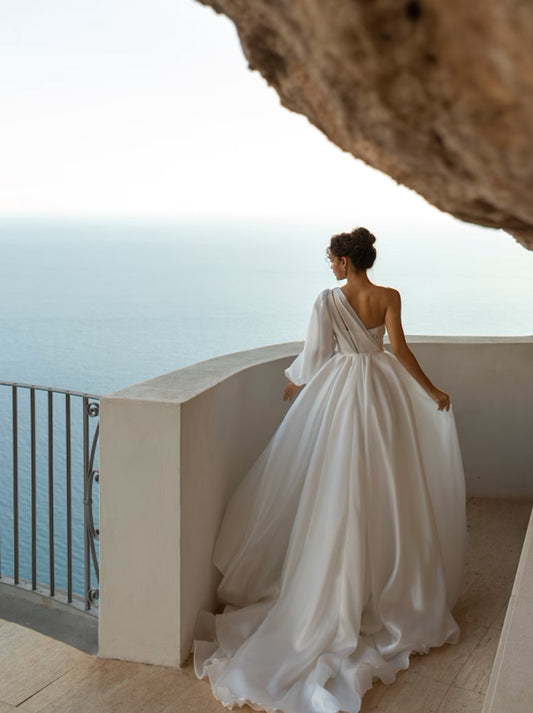 Charming A-Line Wedding Dresses One Shoulder Appliqued One Long Sleeves Sweep Train Satin Bridal Gowns Custom Made