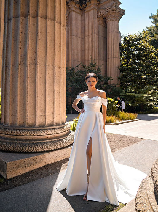 Charming A-Line Wedding Dresses Strapless Pleated Flowers Cap Sleeves Satin Sweep Train Bridal Gowns With Slit