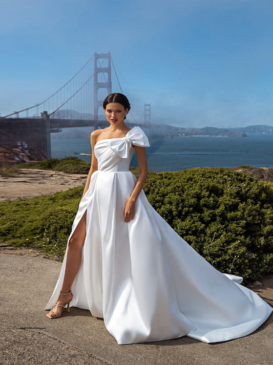 Charming A-Line Wedding Dresses One Shoulder Pleated Bowknot Satin Detachable Sweep Train Bridal Gowns With Slit