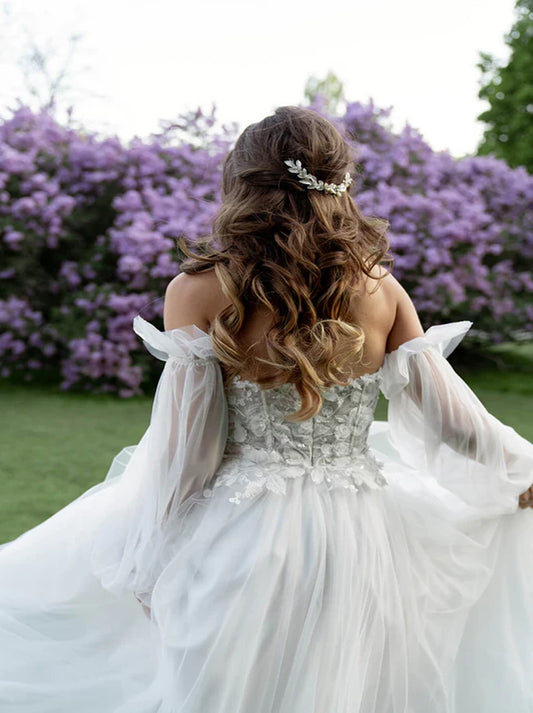 Classic & Simple A-Line Wedding Dresses Sweetheart Appliqued Tulle Sweep Train Bridal Gowns With Detachable Long Sleeves